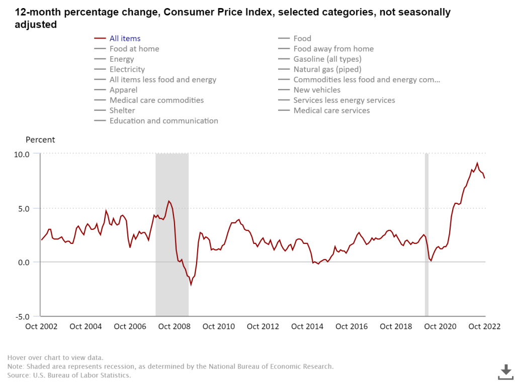 In October, the Consumer Price Index for All Urban Consumers increased 0.4 percent, seasonally adjusted, and rose 7.7 percent over the last 12 months, not seasonally adjusted. The index for all items less food and energy increased 0.3 percent in October (SA); up 6.3 percent over the year (NSA).
