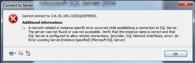 A network-related or instance-specific error occurred while establishing a connection to SQL Server. The server was not found or was not accessible. Verify that the instance name is correct and that SQL Server is configured to allow remote connections. (provider: Named Pipes Provider, error: 40 – Could not open a connection to SQL Server)