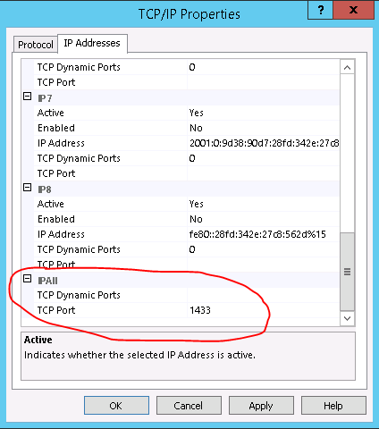 Scroll down to IPAll. Make sure that TCP Dynamic Ports is blank. Make sure that TCP Port is set to 1433.