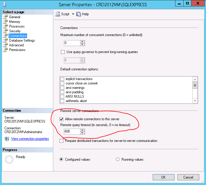 Navigate to Connections and ensure that Allow remote connections to this server is checked.