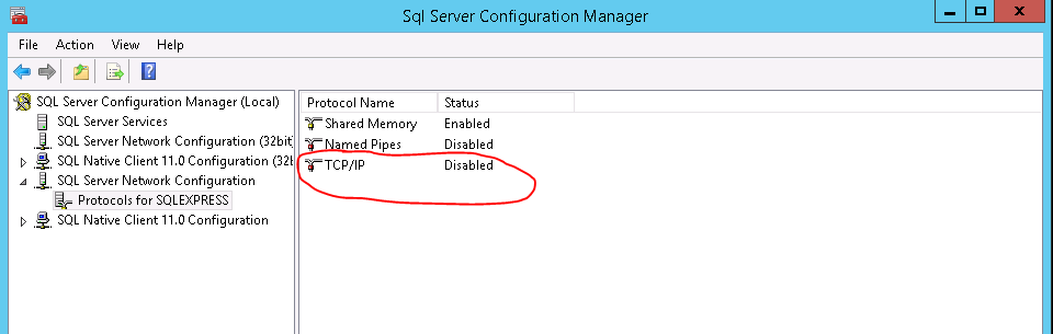 The next good thing to check is the SQL Server Network Configuration. Open the SQL Server Configuration Manager, unfold the node SQL Server Network Configuration and select Protocols for MSSQLServer (or whatever the name of your SQL Server instance is).