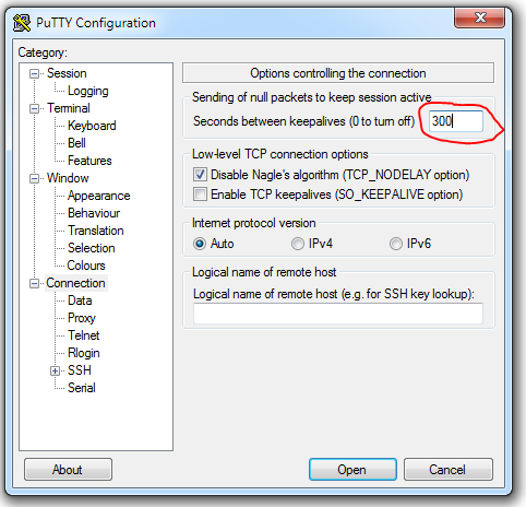 - In the Seconds between keepalives (0 to turn off), type 300. (With this configuration, PuTTY sends a packet to the server every 300 seconds -5 minutes – to keep the connection alive.