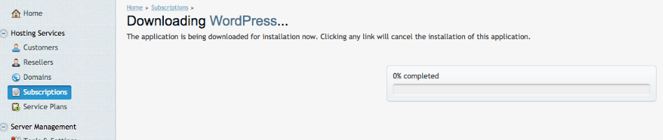 When the WordPress Install button is pressed (including the custom install option) in Application Vault, a progress bar is shown but never changes from 0%.