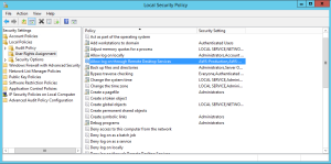 Expand Local Policies and select User Rights Assignment. A list of polices will appear on the right hand side. Right click on the policy named “Allow log on through Remote Desktop Services” and select Properties.