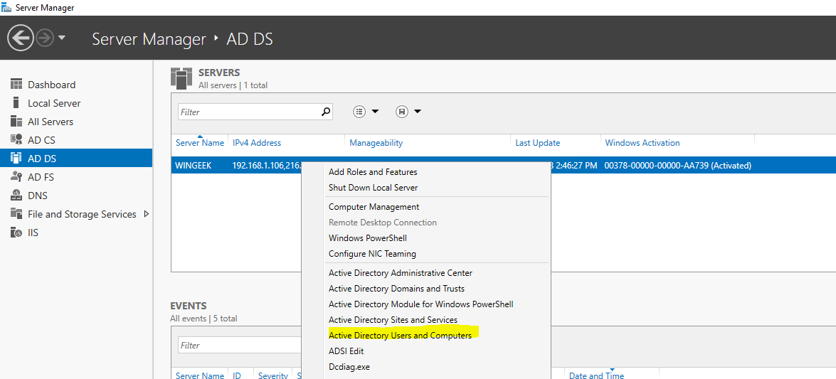 Open Server Manager. Go To AD DS on the left and click. Right click on the server in the middle and go to “Active Directory Users and Computers”.