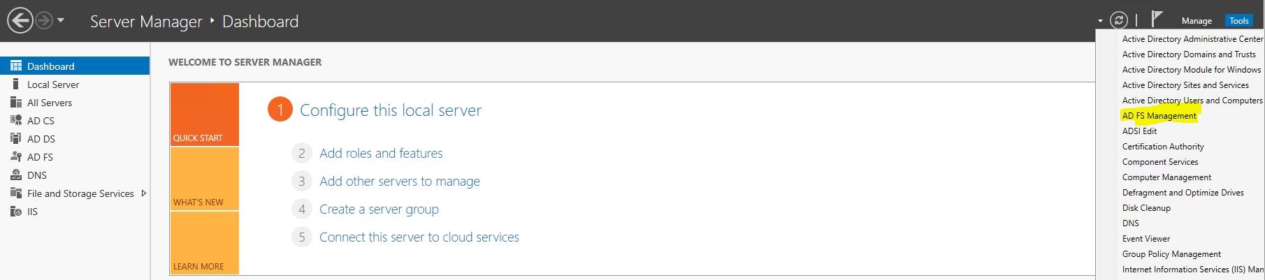Go to the server manager on the server and select on the right – “Tools” and click “AD FS Management”.