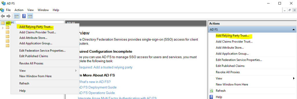 Either right click on the AD FS on the left and choose “Add Relying Party Trust” or on the Right Side.