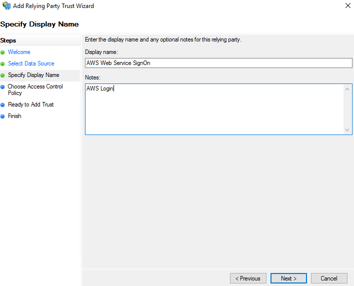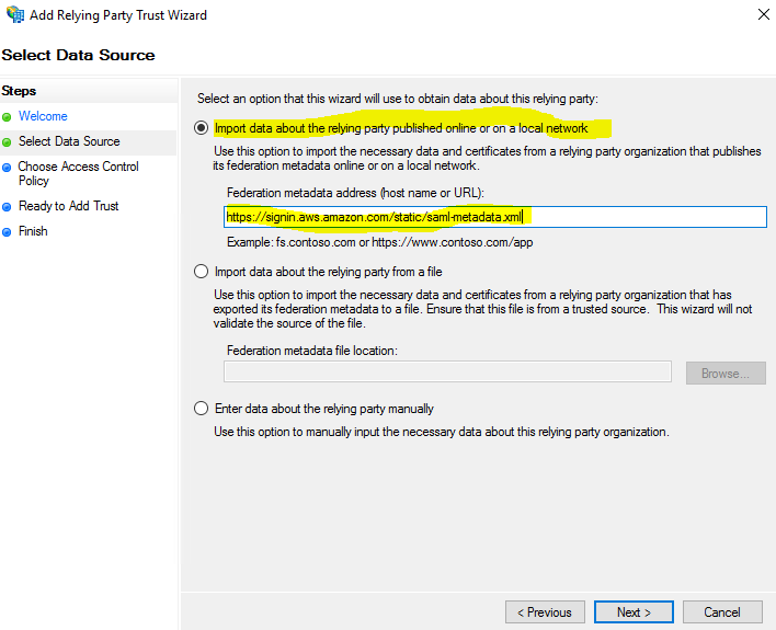 and then click Next. The metadata XML file is a standard SAML metadata document that describes AWS as a relying party.