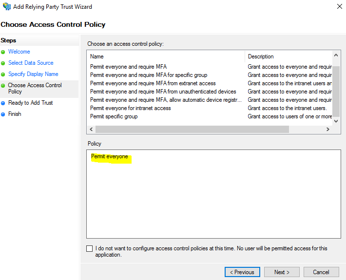 Choose your authorization rules. For my scenario, I chose Permit all users to access this relying party. When you’re done, click Next.