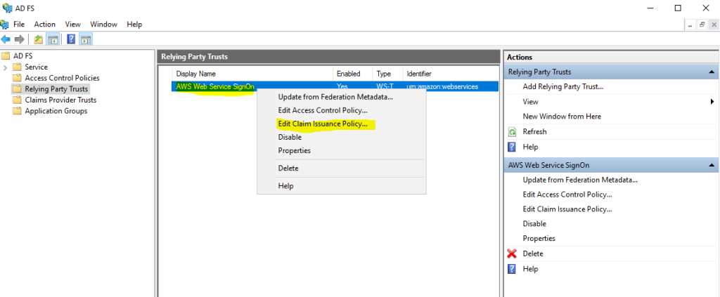 In these steps we’re going to add the claim rules so that the elements AWS requires and ADFS doesn’t provide by default (NameId, RoleSessionName, and Roles) are added to the SAML authentication response. If you forgot to check the box to launch the claim rule dialog, right-click on the relying party (in this case Amazon Web Service SignOn) and then click Edit Claim Issuance Policy.