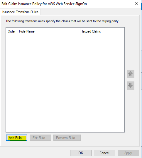 In the Edit Claim Issuance Policy for AWS Web Service SignOn dialog box, click Add Rule.