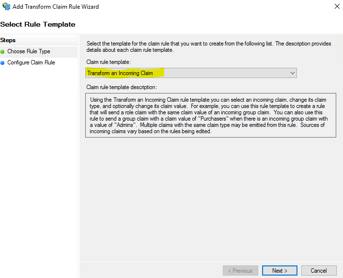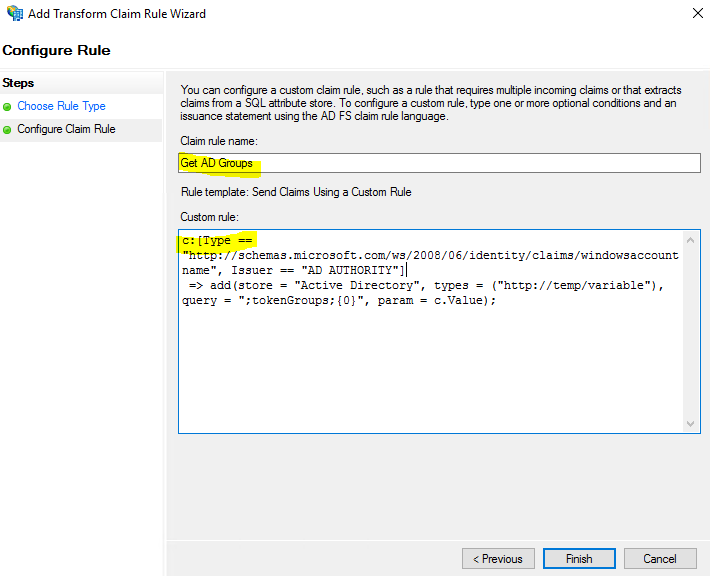 c:[Type == "http://schemas.microsoft.com/ws/2008/06/identity/claims/windowsaccountname", Issuer == "AD AUTHORITY"] => add(store = "Active Directory", types = ("http://temp/variable"), query = ";tokenGroups;{0}", param = c.Value);