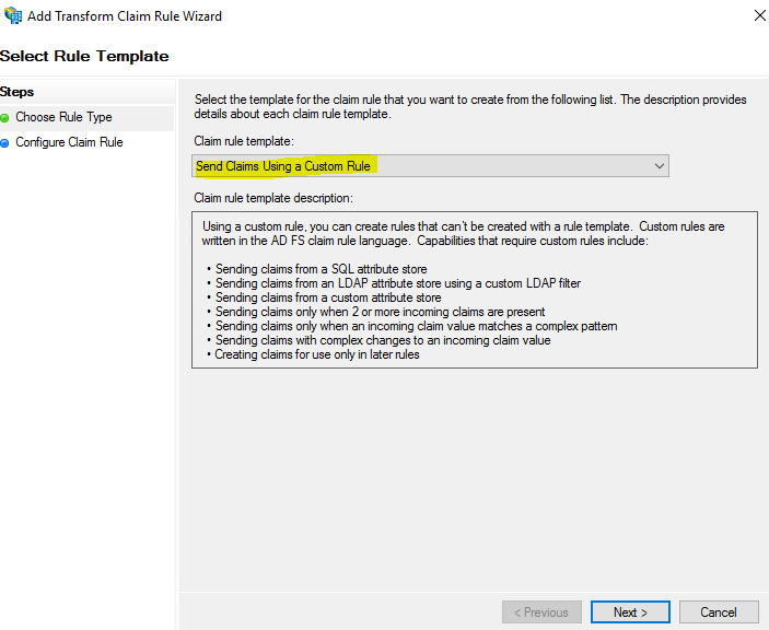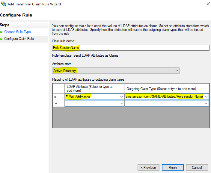 I’ll pause here to provide a little more context because for these steps it might not be as obvious what’s going on. Unlike the two previous claims, here I used custom rules to send role attributes. This is done by retrieving all the authenticated user’s AD groups and then matching the groups that start with to IAM roles of a similar name. I used the names of these groups to create Amazon Resource Names (ARNs) of IAM roles in my AWS account (i.e., those that start with AWS-).