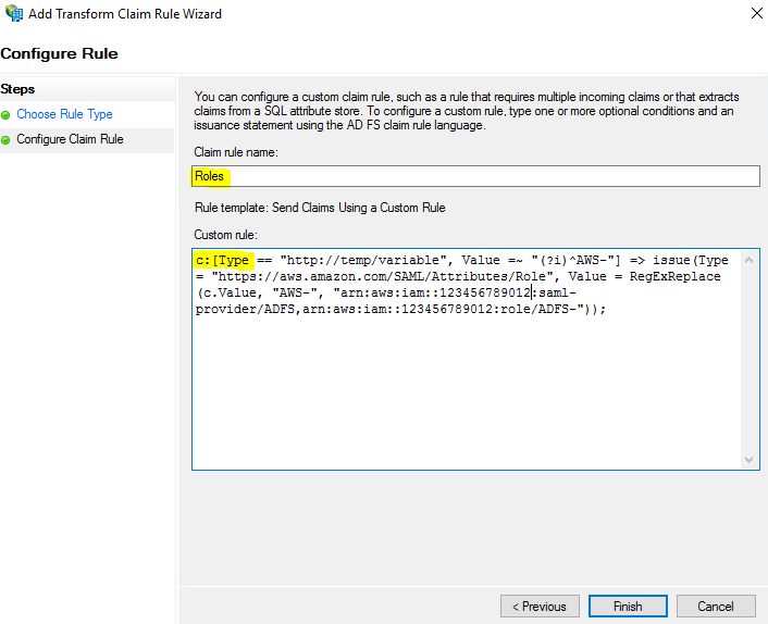 c:[Type == "http://temp/variable", Value =~ "(?i)^AWS-"] => issue(Type = "https://aws.amazon.com/SAML/Attributes/Role", Value = RegExReplace(c.Value, "AWS-", "arn:aws:iam::123456789012:saml-provider/ADFS,arn:aws:iam::123456789012:role/ADFS-"));