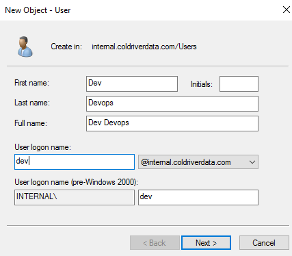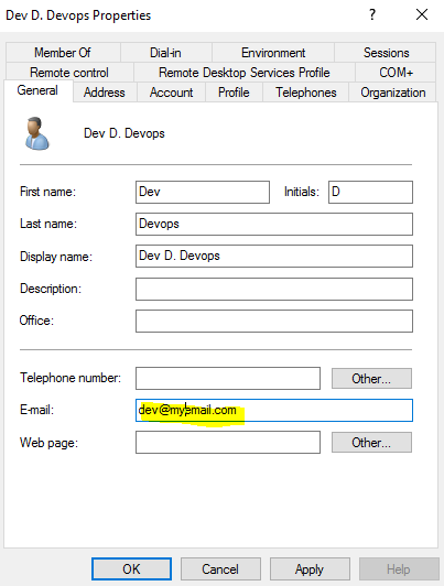 Note: In windows 2016, the users set up in Active directory may have a different sign in domain depending on how you set it up. Check the email vs the User logon name in the Active Directory Users and Computers.