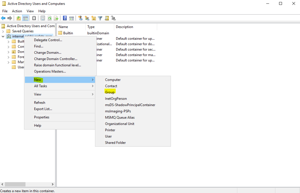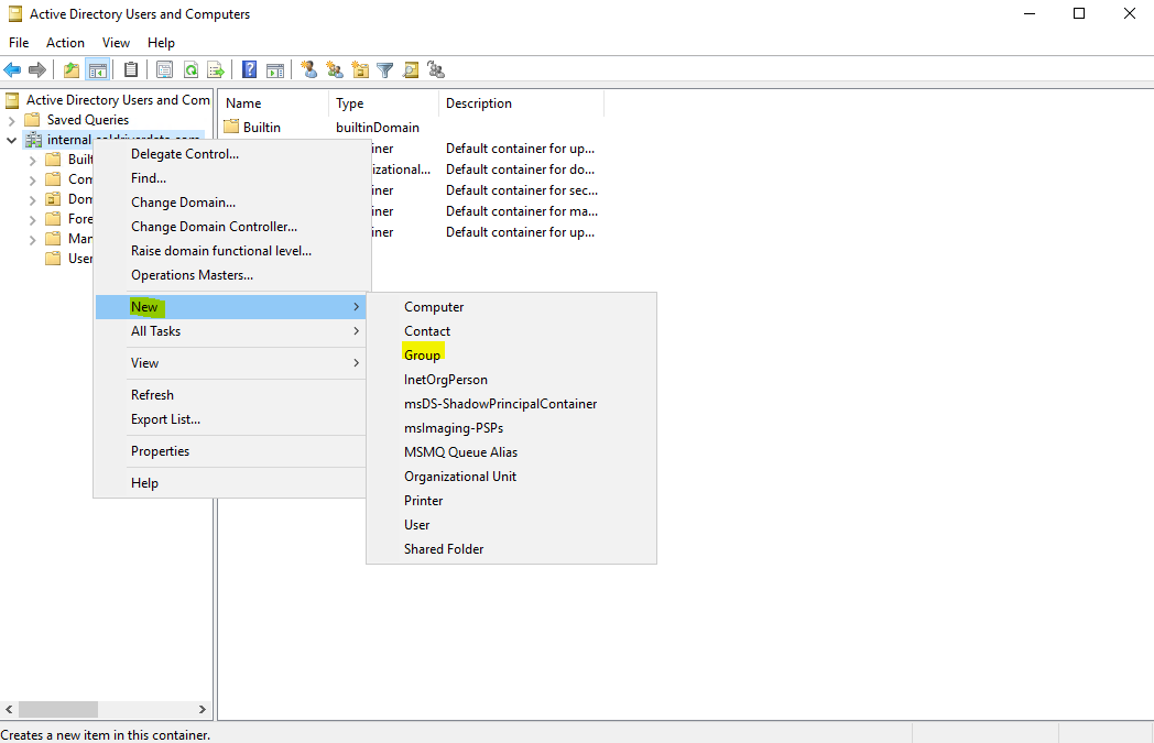 Create our Groups. Right Click the server name and go to “New” and click “Group”.