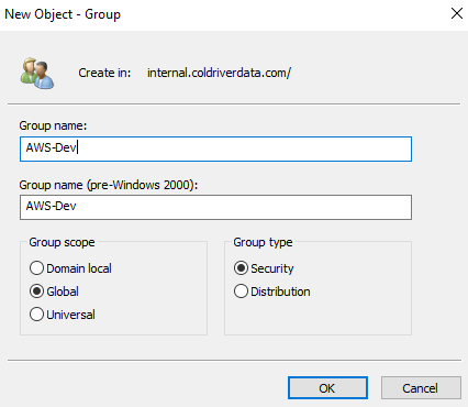 - Create two AD Groups named AWS-Production and AWS-Dev. AWS Production will have users that have administrative access and the AWS-Dev will have S3 , EC2 and RDS servies in AWS.
