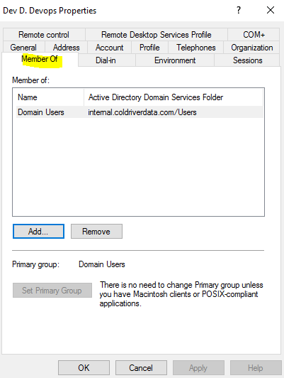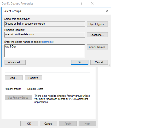 Click Add. Type AWS and click check names. The AWS-Dev should be displayed. Click OK. Click OK again.