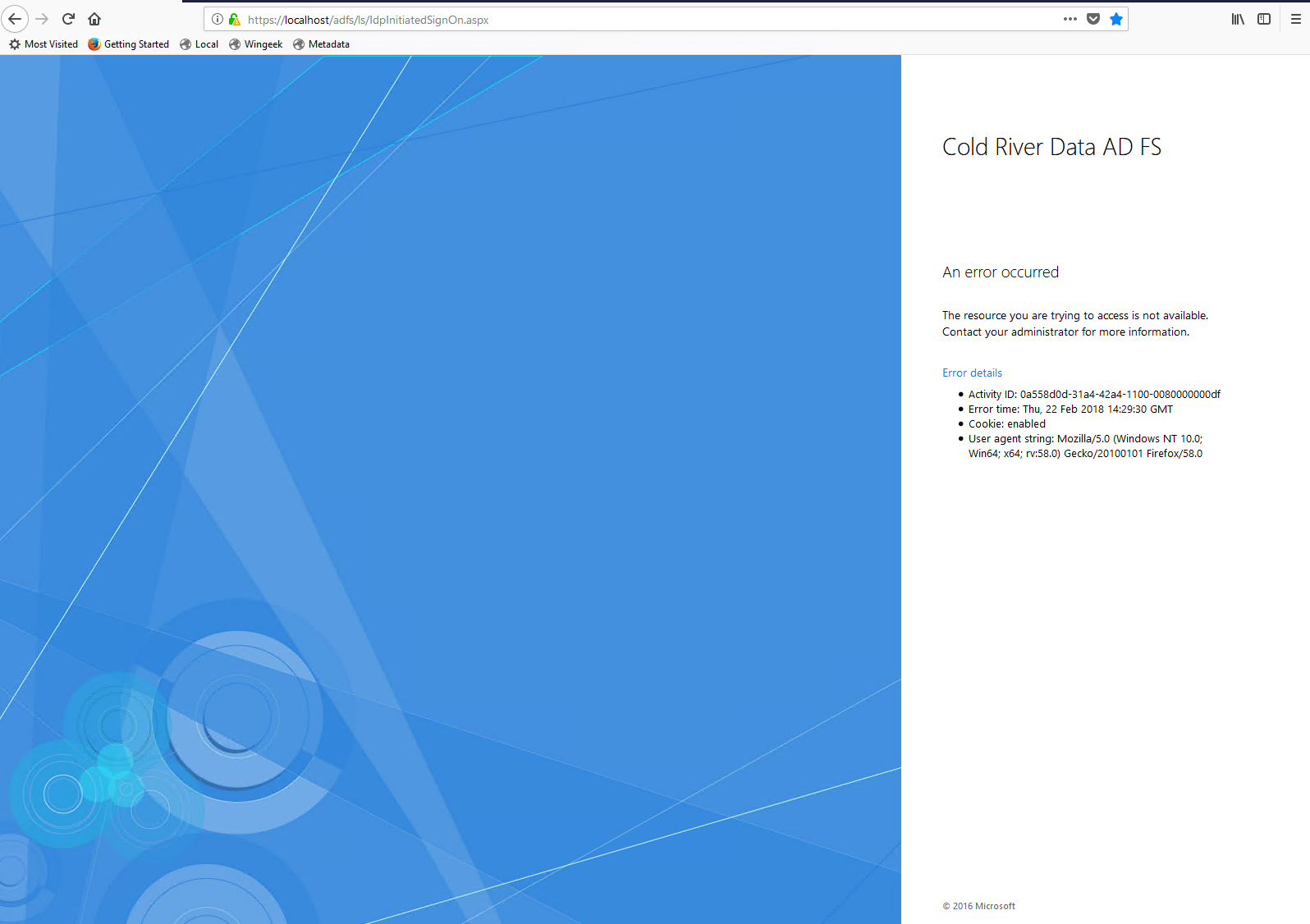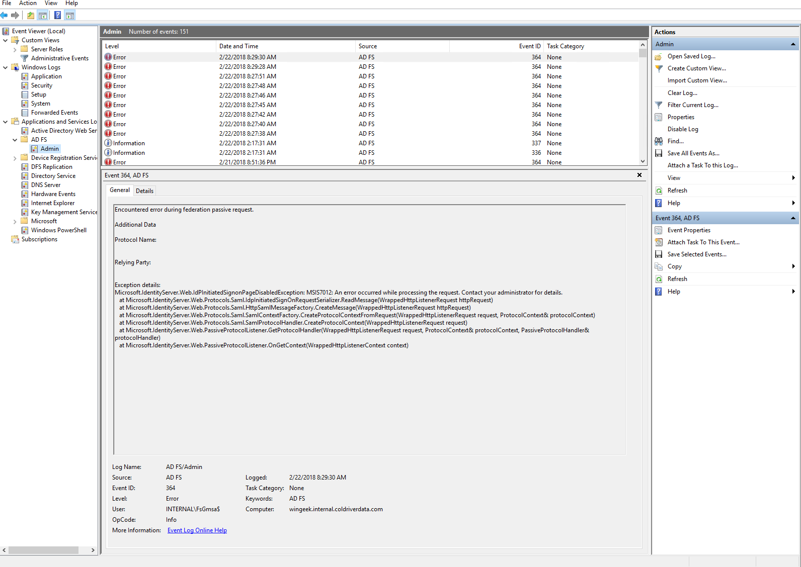 But when I looked closely I noticed the line Microsoft.IdentityServer.Web.IdPInitiatedSignonPageDisabledException.