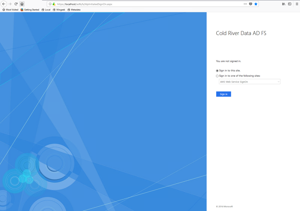 If we try the https://localhost/adfs/ls/IdpInitiatedSignon.aspx again we now receive a known web page with a Sign In button.