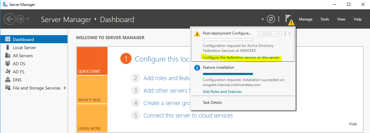 Now, back at the server manager, click the top yellow warning icon at the top of server manager and click on “Configure the federation service on this server”.