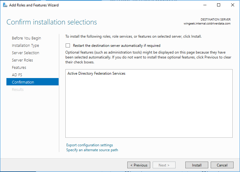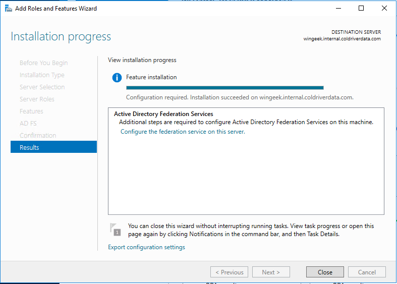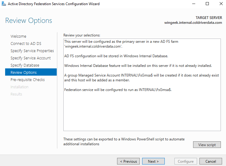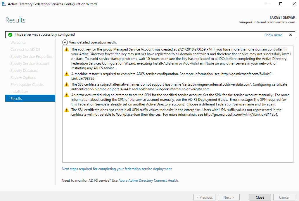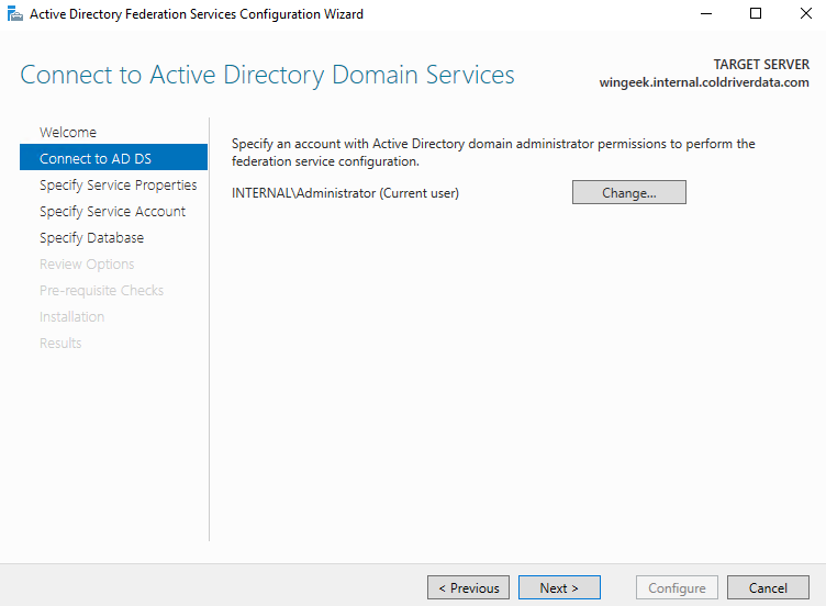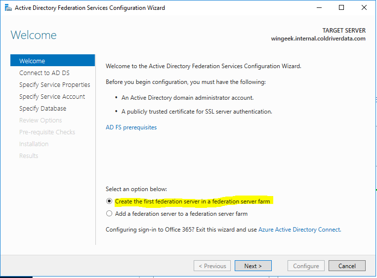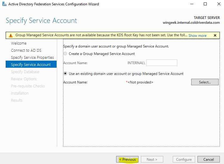 Exit PowerShell. Now bring up the ADFS wizard again. Click Previous.