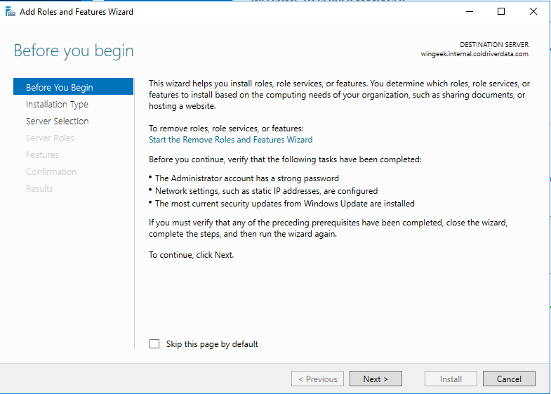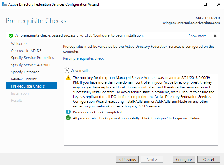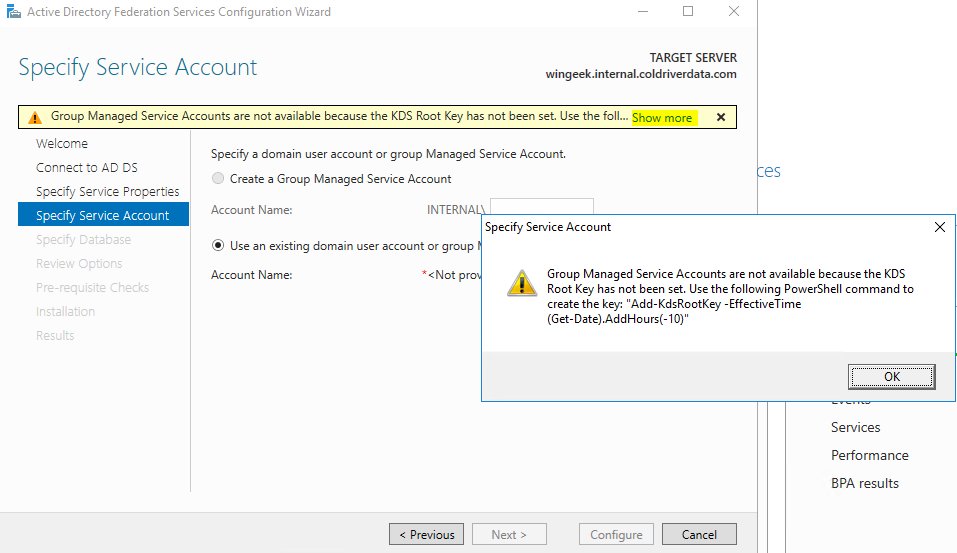 On the next page we are informed that we need to run a powershell command to add a Root Key. Windows manages the account and password for the service account.