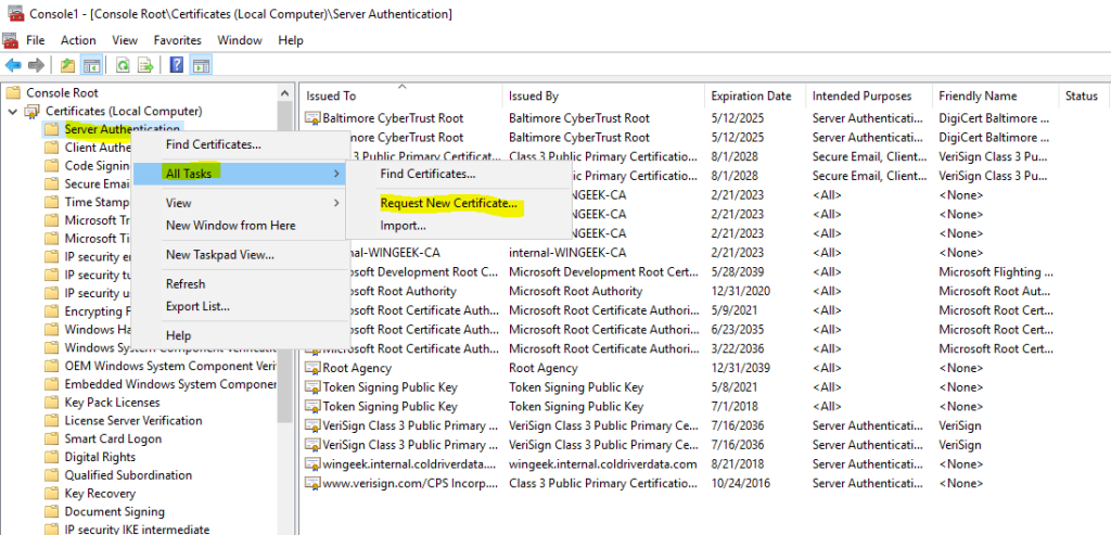 Right Click on “Server Authentication”. Go to All Tasks and click on “Request New Certificate”.