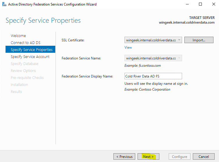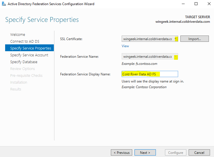 Select the SSL Certificate from the drop down and give the Federation Service a Display Name that the users will see at the login.