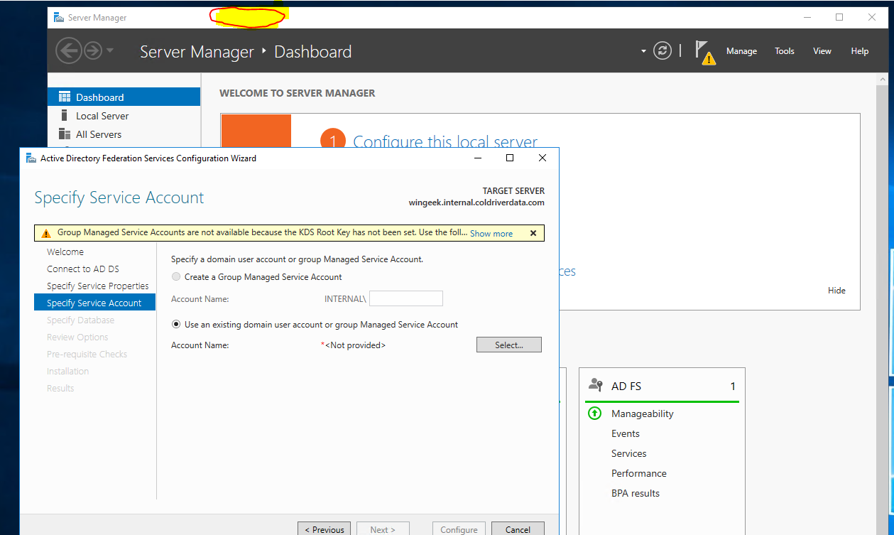 To run the command, click on the top of the server manager page to display (do not close the ADFS wizard as we will need to come back to it).