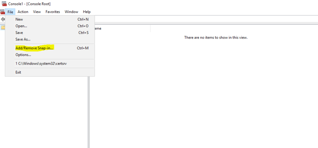 In the console, select “File” > “Add/Remove Snap-in”.