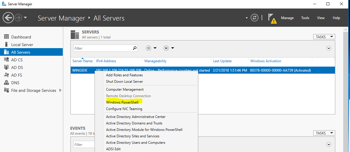 Select All Servers on the left and then right click on the Domain Controller and then click on Windows PowerShell.