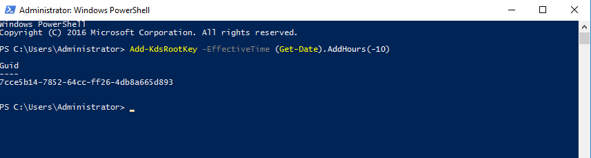 Add-KdsRootKey -EffectiveTime (Get-Date).AddHours(-10)