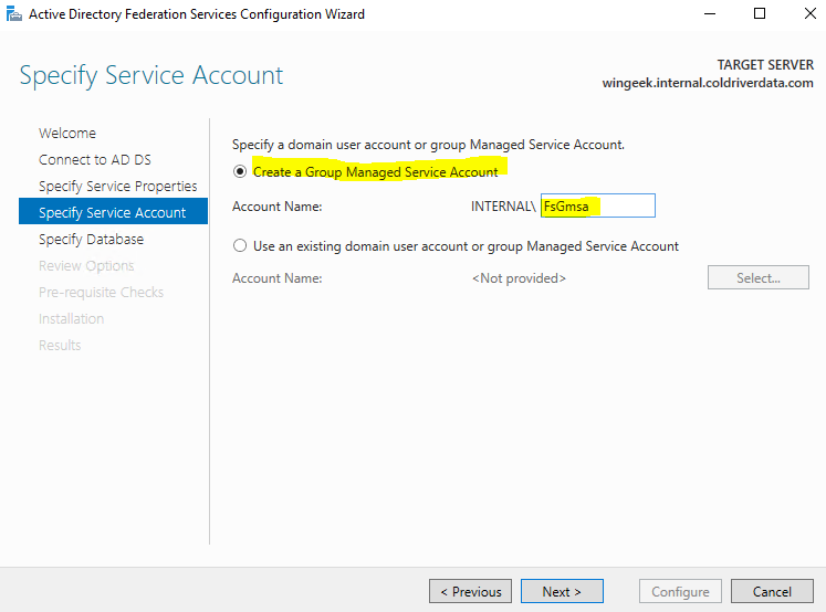 Now the warning is gone and we can set up the Group Managed service Account as “FsGmsa (Federation Service, Group Managed Service Account)”.