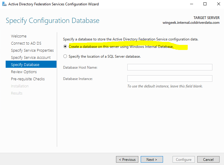 Now, we need a databse to store the configuration data. In this case, I am creating an internal database.