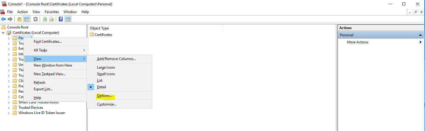 On the following screen, right click on “Personal”, go to “View” and then click on “Options”.