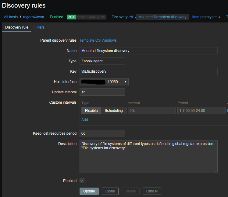 Check Configuraton > Hosts > Server Name > Click on Discovery inline with server namre > Mounted filesystem discovery. Find “Keep lost resources period:. Change from 31d to 0d.