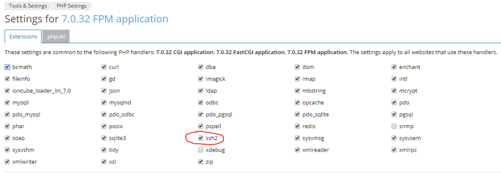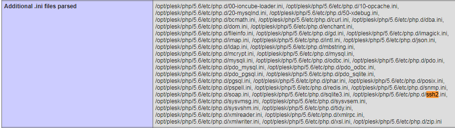 # echo "extension=ssh2.so" > /opt/plesk/php/7.0/etc/php.d/ssh2.ini