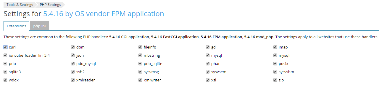 Now you can go to Tools and Settings > General > PHP Settings > 7.0.32 FPM application (or any of the activated 7.0.32 links). And you should see: