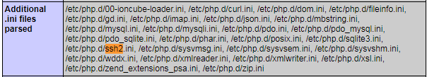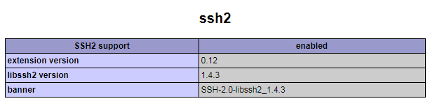 # php -i | grep ssh2 /etc/php.d/ssh2.ini, Registered PHP Streams => https, ftps, compress.zlib, compress.bzip2, php, file, glob, data, http, ftp, phar, ssh2.shell, ssh2.exec, ssh2.tunnel, ssh2.scp, ssh2.sftp, zip PHP Warning: Unknown: It is not safe to rely on the system's timezone settings. You are *required* to use the date.timezone setting or the date_default_timezone_set() function. In case you used any of those methods and you are still getting this warning, you most likely misspelled the timezone identifier. We selected the timezone 'UTC' for now, but please set date.timezone to select your timezone. in Unknown on line 0 libSSH Version => libssh2/1.4.3 ssh2 libssh2 version => 1.4.3 banner => SSH-2.0-libssh2_1.4.3