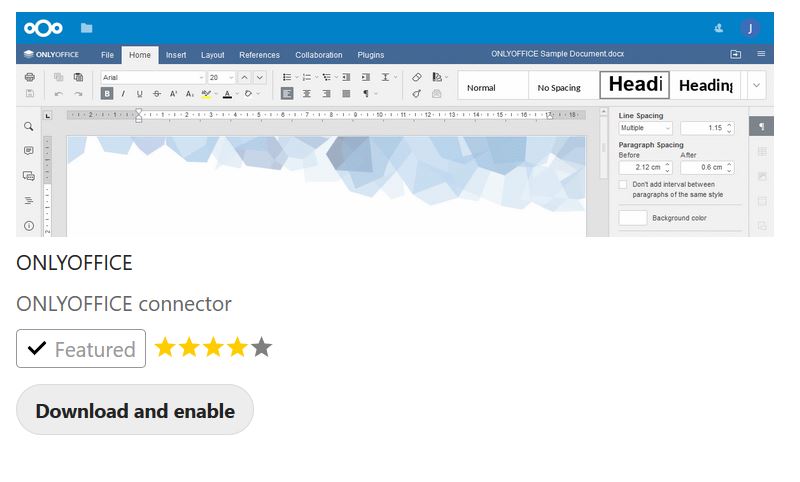 1. Install the Community Document Server App. Use the search keywords ‘document’ or ‘community’ in the app installation screen in Nextcloud. Click “Download and Enable”.
