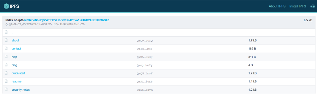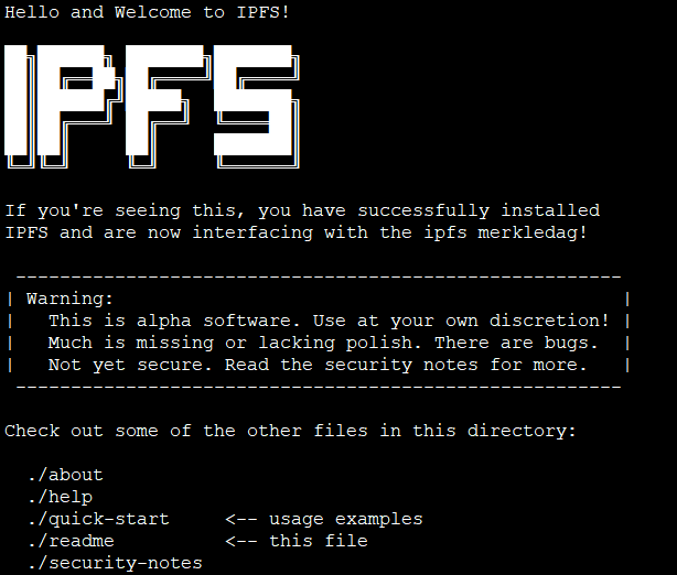 $ ipfs cat /ipfs/QmQPeNsJPyVWPFDVHb77w8G42Fvo15z4bG2X8D2GhfbSXc/readme