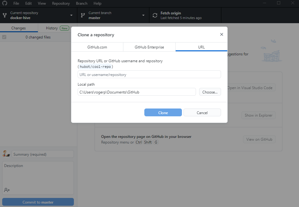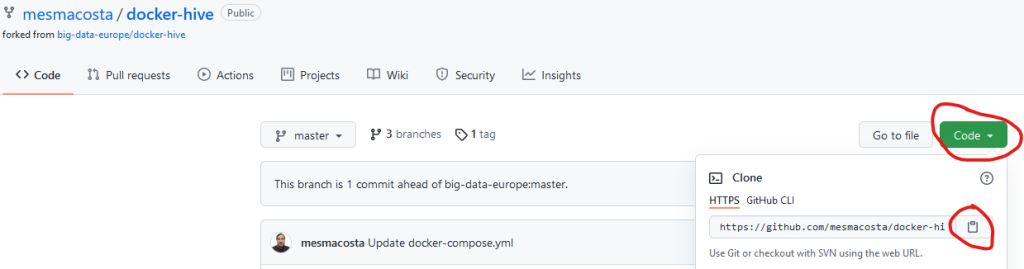 Go to https://github.com/mesmacosta/docker-hive – Click on Code > Copy. Paste URL into Github Desktop. Click Clone.