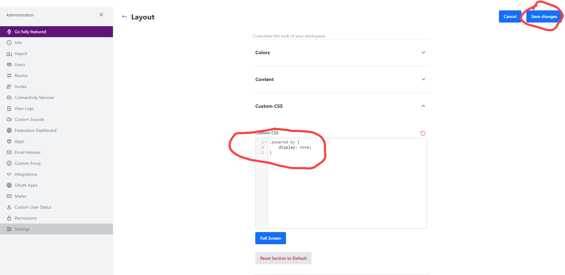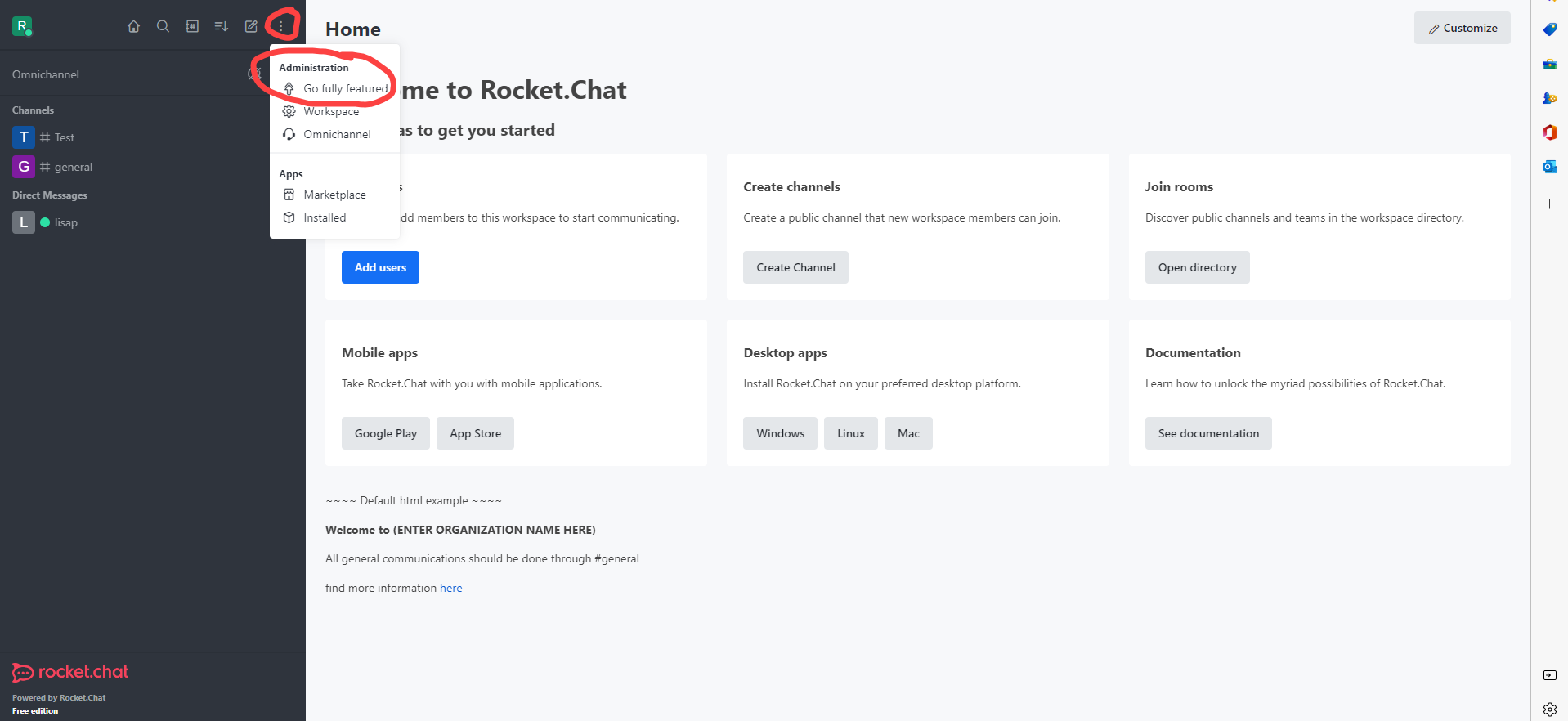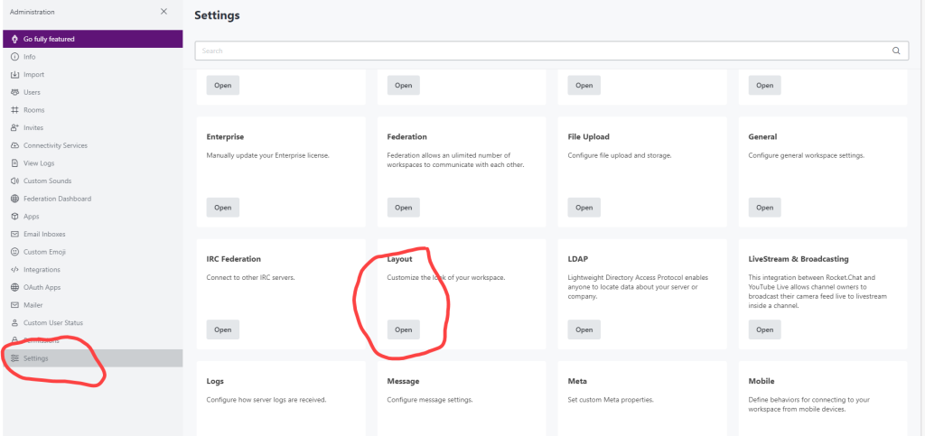 To modify the message or edit, Login to Rocket Chat with Admin rights. Go to the 3 dots … and click to see the Administration menu. Click on “Go Fully Featured”.