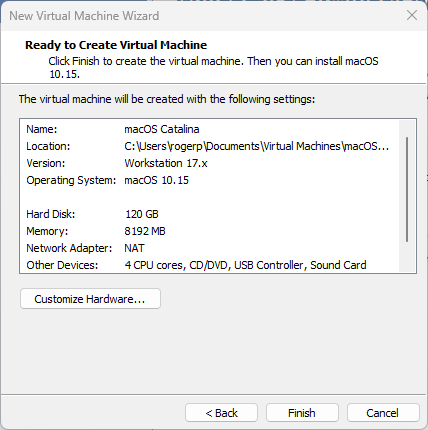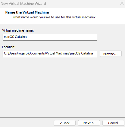 Name the virtual machine as you prefer like macOS Catalina. Click Browse then choose a location to save virtual machine files and click Next, or you may let it as default.