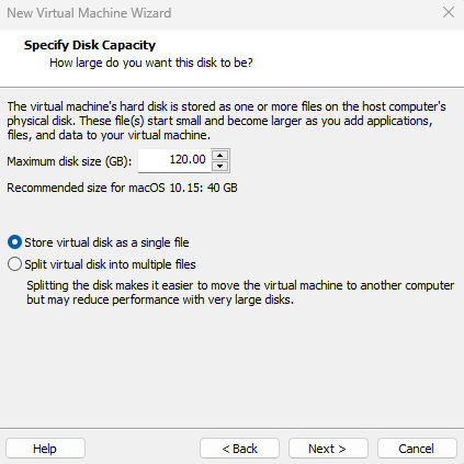 Specify the disk size of 120 GB or more than 50 GB. Then select Store virtual disk as a single file and click Next.