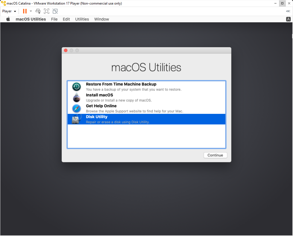 Now, you’ll see macOS Utilities Window. From the list, select Disk Utility and click Continue.