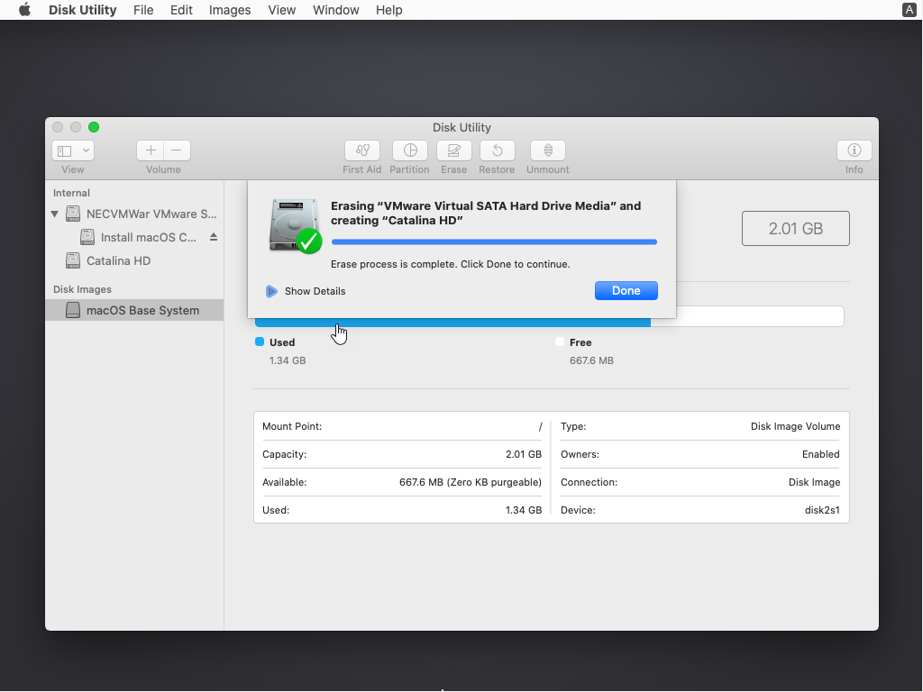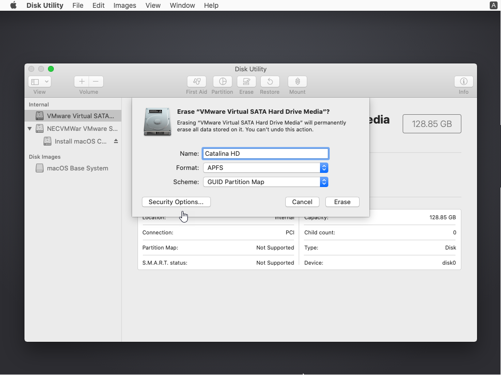 Select VMware Virtual SATA Hard Drive Media then click Erase. Choose the following options and again click Erase.