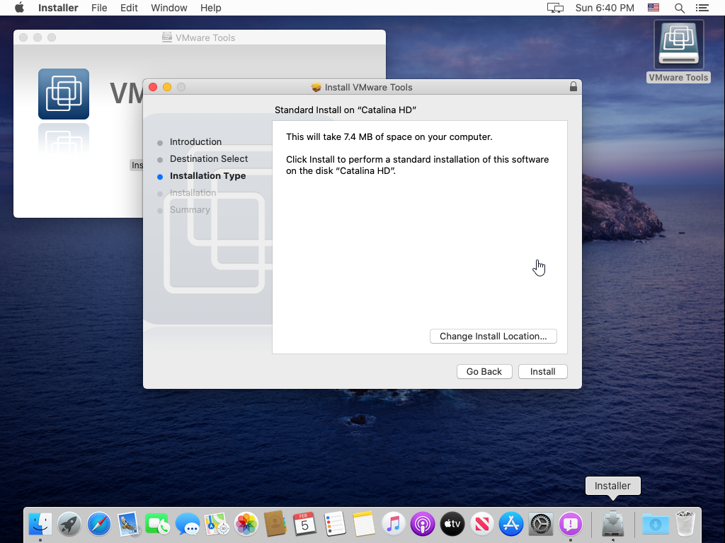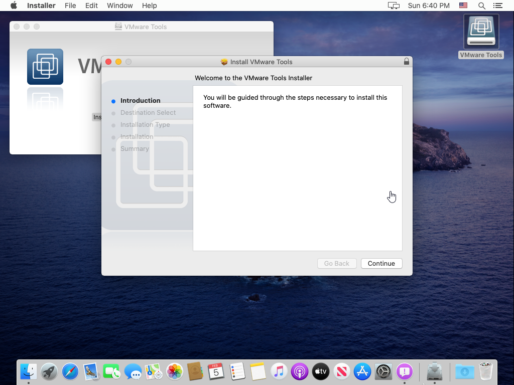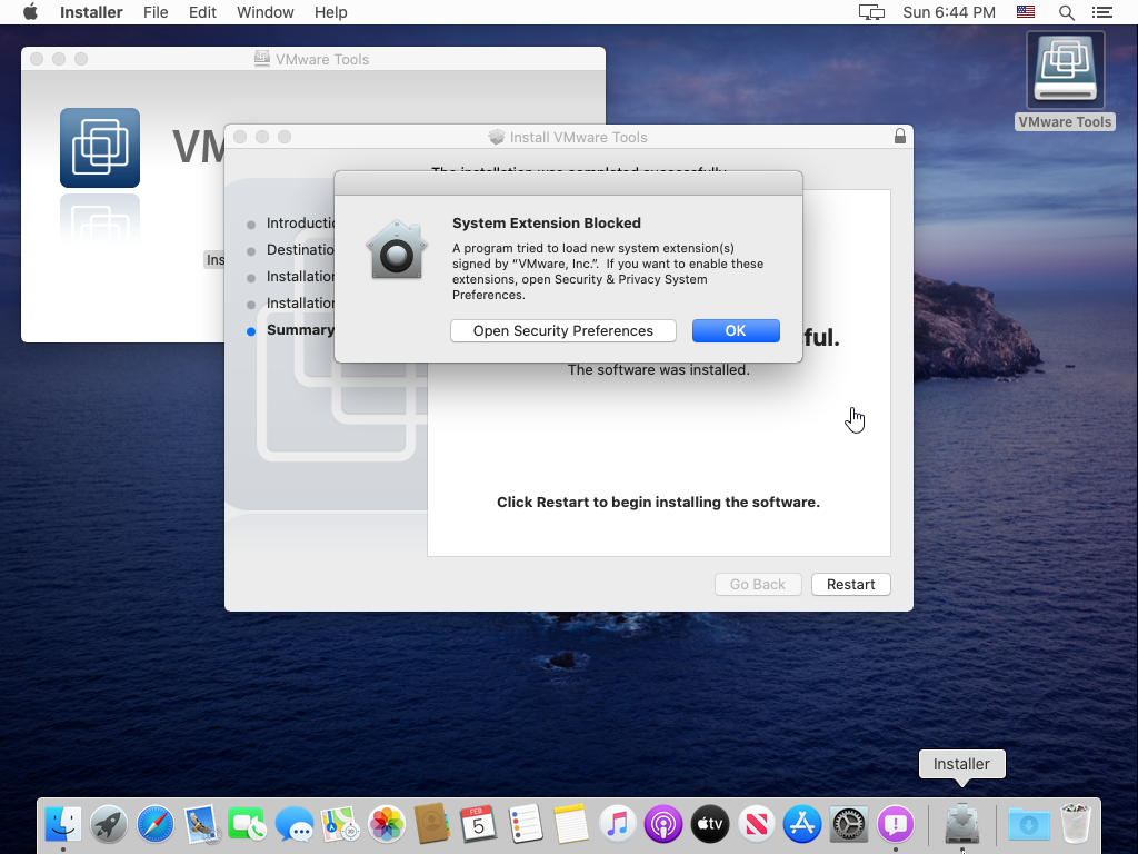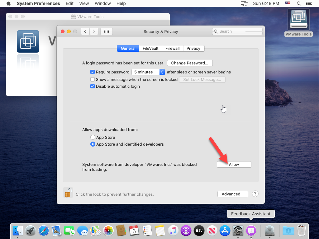 Click Allow to enable the VMware tools extension to be installed from the security & privacy window.