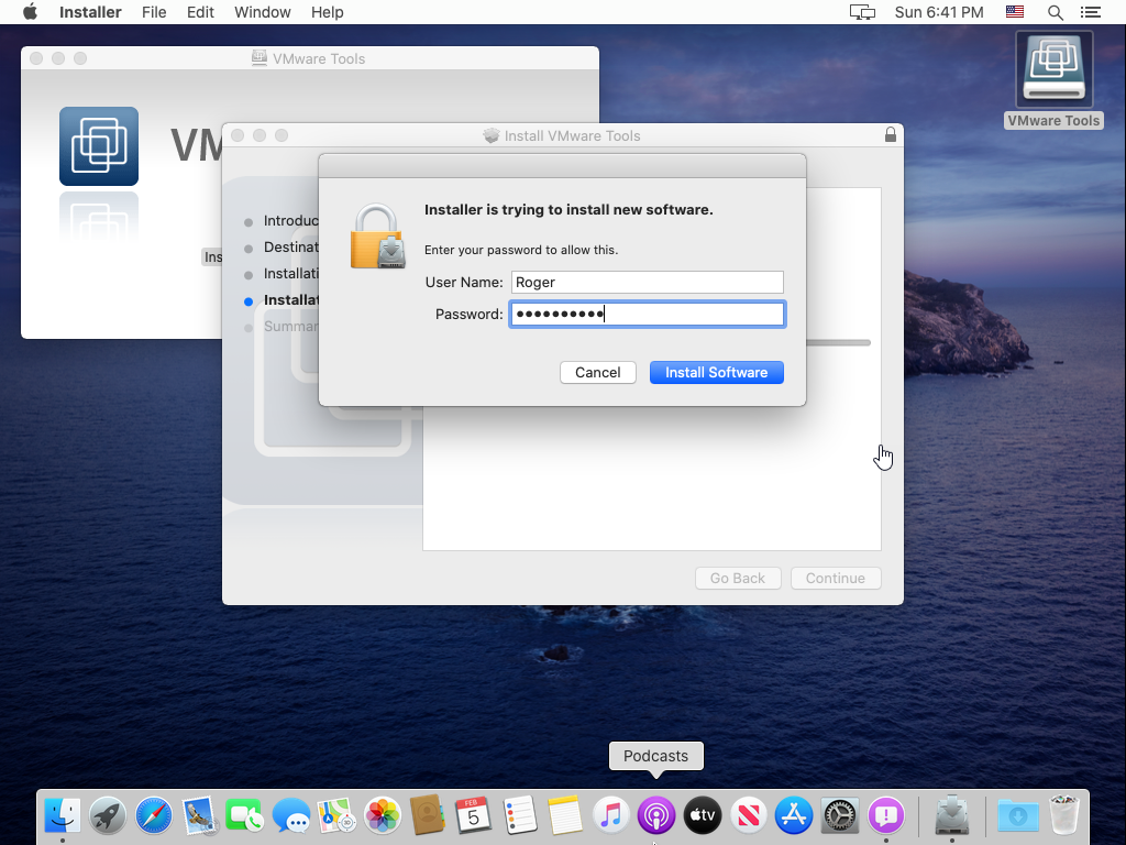 macOS Catalina VM will restart and after the restart login with your Username and Password.